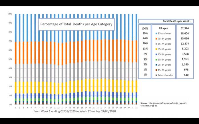 After retrieving data on the CDC website, Briand compiled a graph representing percentages of total deaths per age category from early February to early September, which includes the period from before COVID-19 was detected in the U.S. to after infection rates soared.