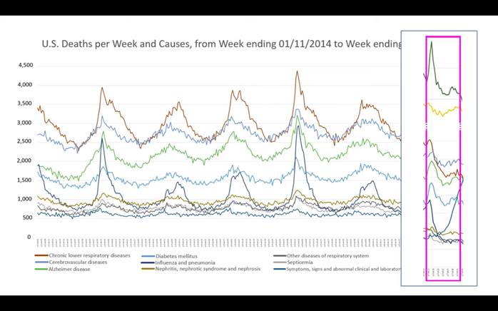 Graph depicts the total decrease in deaths by various causes, including COVID-19.