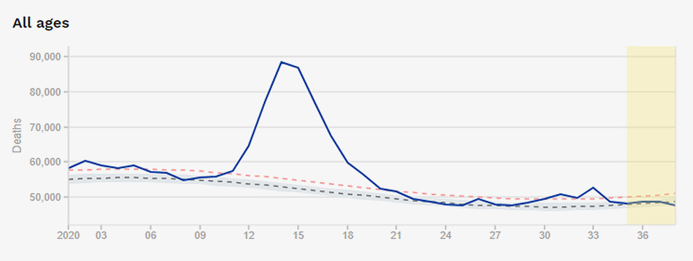 Below is the EuroMOMO graph of all deaths across Europe on a week-by-week basis in 2020. As you can see there is a big rise in excess deaths, that started in late March and was finished by the middle of May. There was a further small blip in early September, which has now gone.