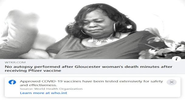 · In Virginia, a 58-year-old grandmother died within hours after receiving the vaccine, but, as Facebook’s “fact checkers” prominently pointed out, it had to be just another coincidence, because the “vaccines have been tested for safety extensively.”