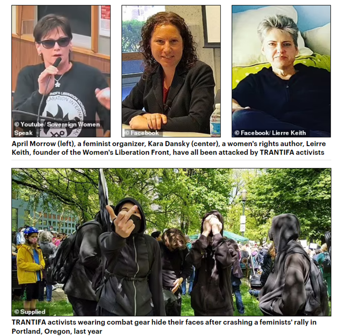 Kara Dansky, a feminist author and president of Women’s Declaration International in the US and other feminists were attacked by a group of black-clad TRANNYFA activists.