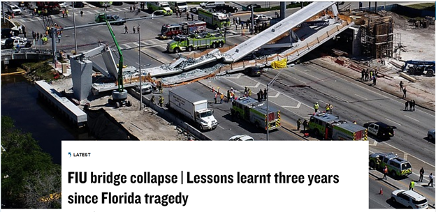 DIE designed Florida International University (FIU) pedestrian bridge collapsed onto a Florida highway, crushing cars and killing six people and injuring 10 others.