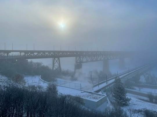 The High-Level Bridge disappears into a heavy ice fog, in Edmonton January Jan. 12, 2024.