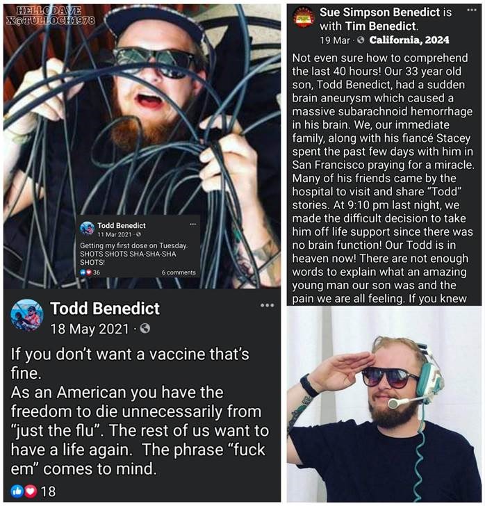 “Not even smart enough how to comprehend the last 40 hours! Our 33-year-old son, Todd Benedict is Tot. He had a “sudden brain” aneurysm which caused a massive subarachnoid hemorrhage in his brain.”