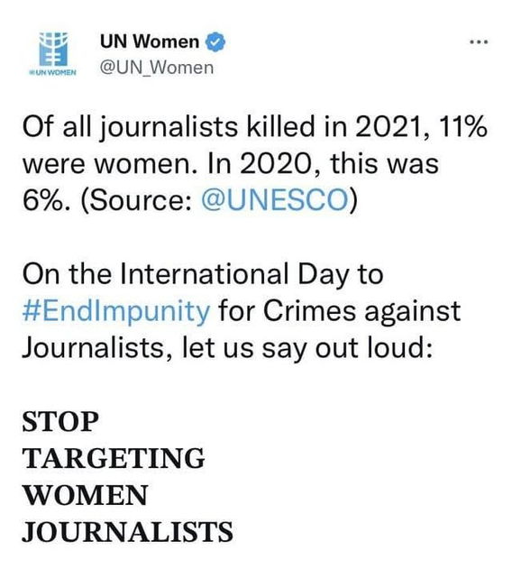 Of all the journalists killed in 2022, 89% were men, 11% were women.
