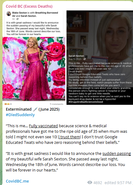 “It is with great sadness I would like to announce the sudden passing of my beautiful wife Sarah Sexton.